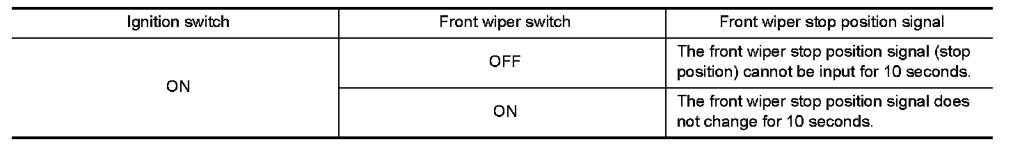 When the front wiper stop position signal is in the conditions listed below, IPDM E/R repeats a front wiper 10 seconds operation and 20 seconds stop five times.