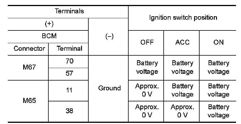 3.Check voltage between BCM harness connector and the ground.