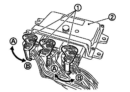 -Before connecting or disconnecting the ECM harness connector, turn ignition switch OFF and disconnect negative battery cable. Failure to do so may damage the ECM because battery voltage is applied to ECM even if ignition switch is turned OFF.