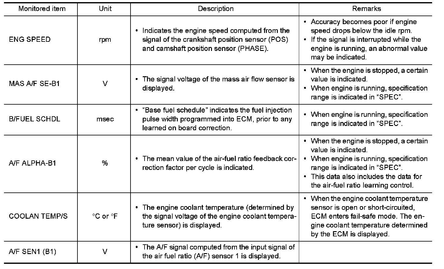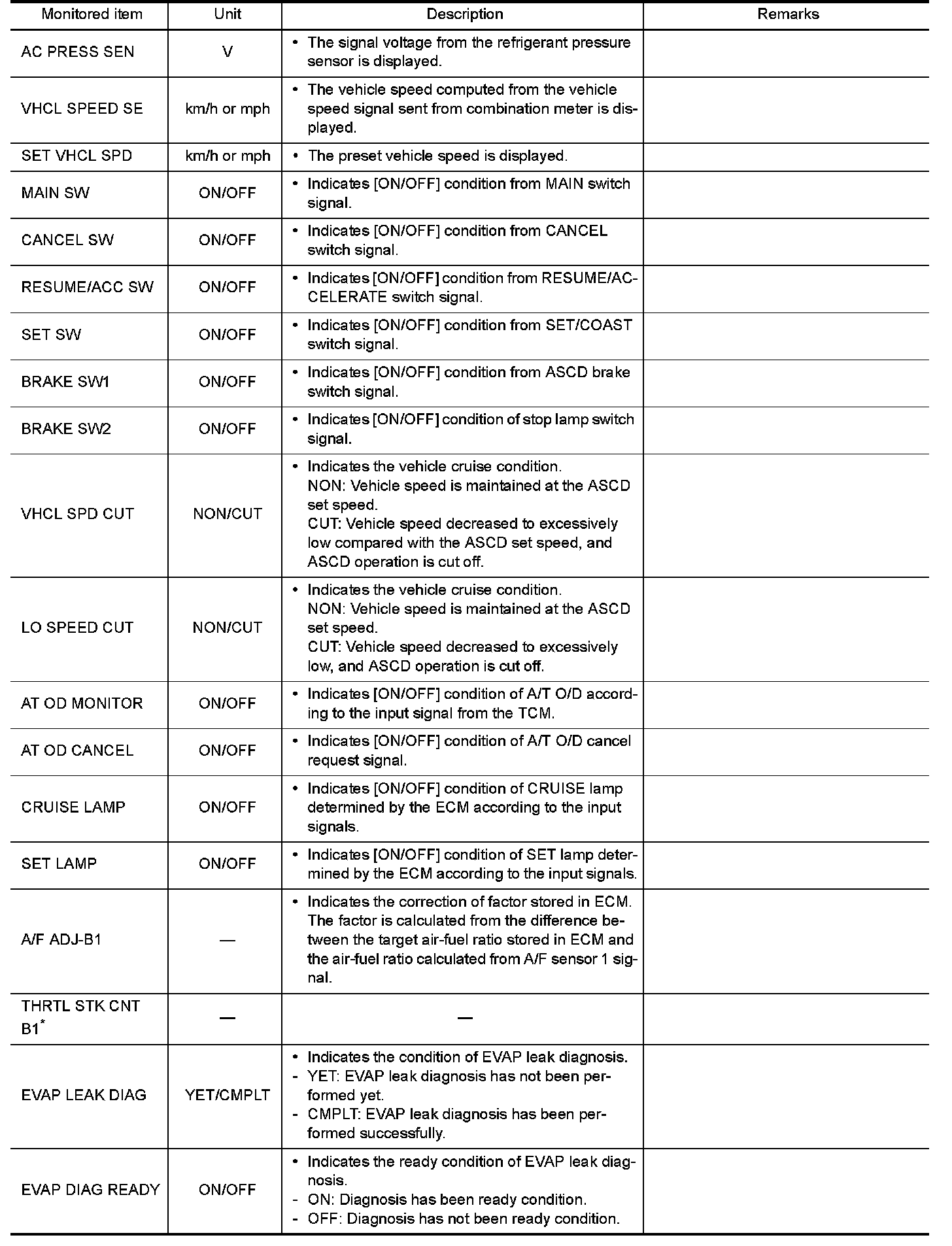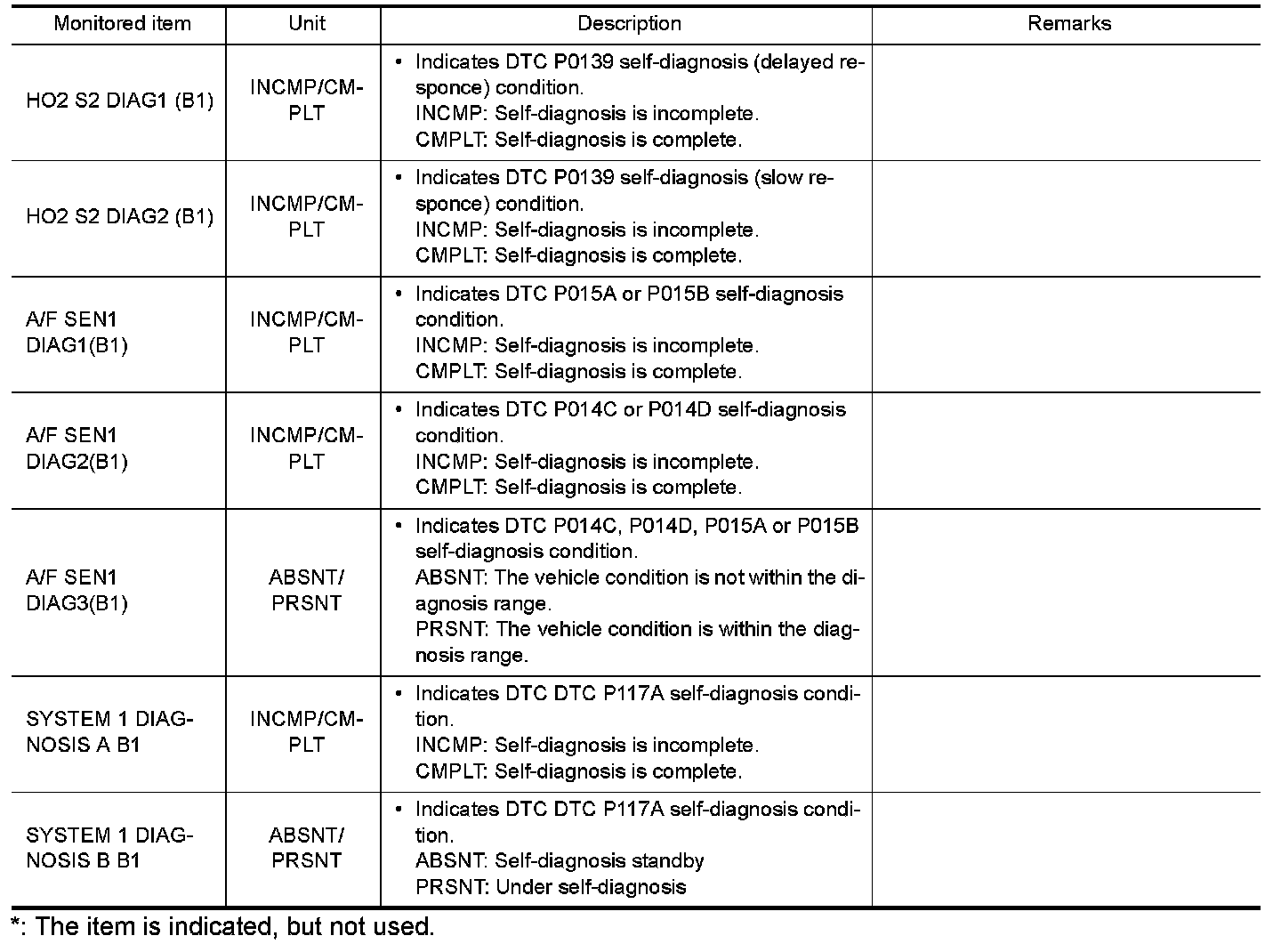 Any monitored item that does not match the vehicle being diagnosed is deleted from the display automatically.