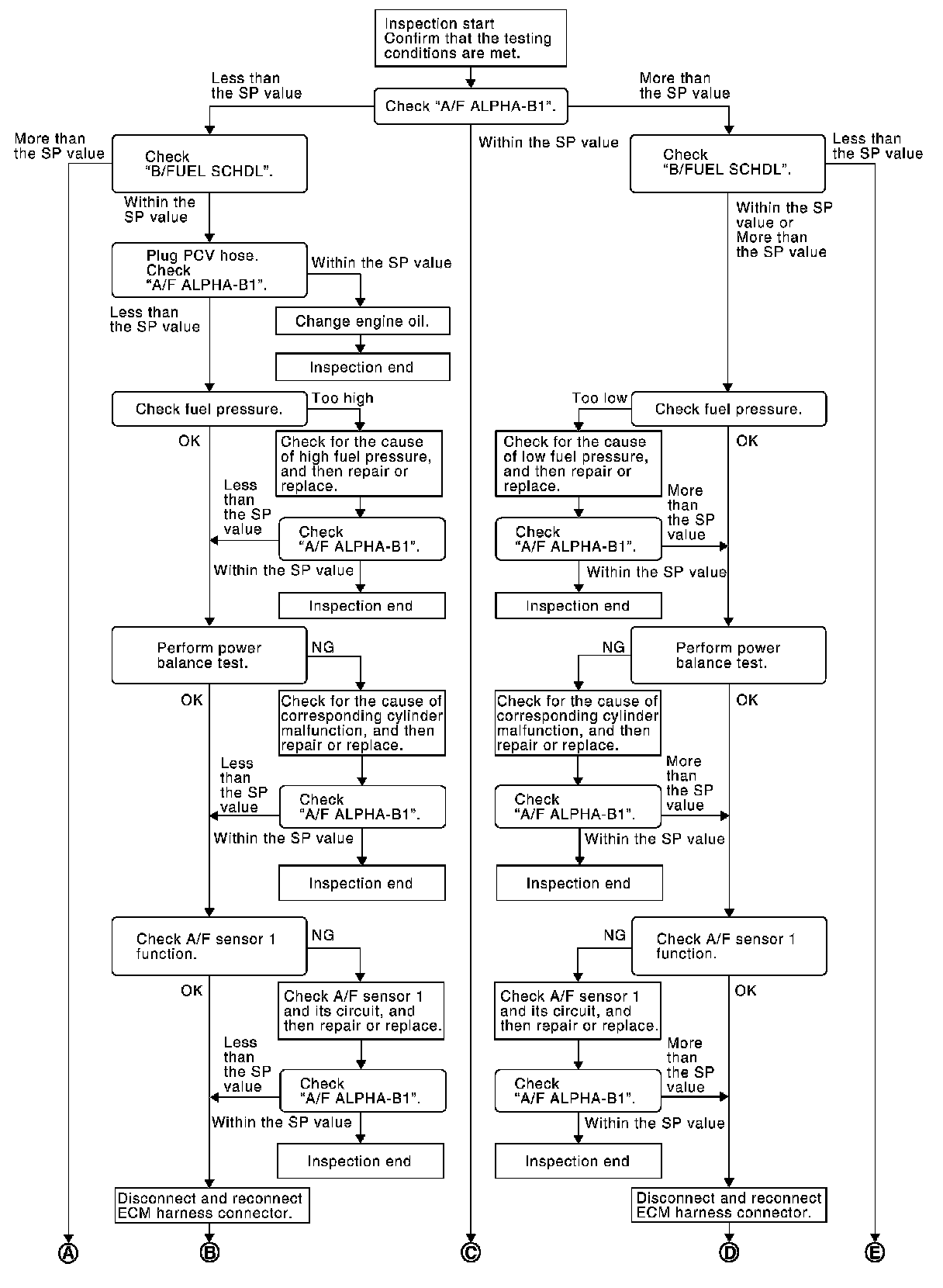 Select "A/F ALPHA-B1" and "B/FUEL SCHDL" in "SPEC" of "DATA MONITOR" mode, and check that each indication is within the SP value.