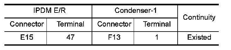 3.Check the continuity between IPDM E/R harness connector and condenser-1 harness connector.