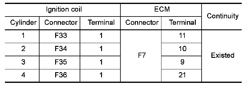 2.Check the continuity between ECM harness connector and ignition coil harness connector.
