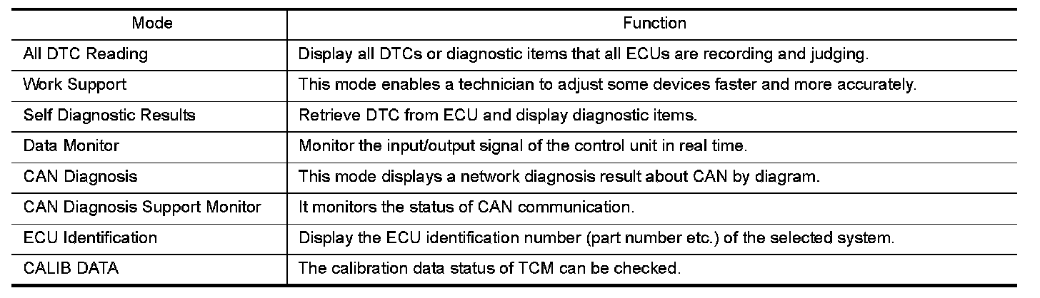 CONSULT can display each diagnostic item using the diagnostic test modes shown following.