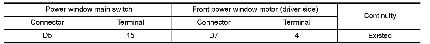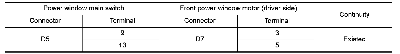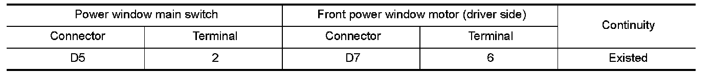 2.Check continuity between power window main switch harness connector and front power window motor (driver side) harness connector.