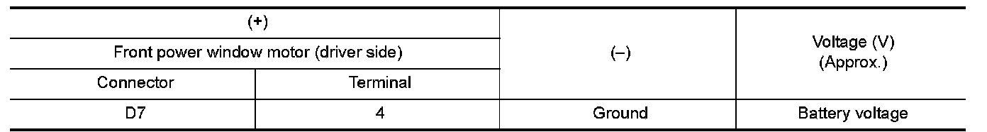 3.Check voltage between front power window motor (driver side) harness connector and ground.