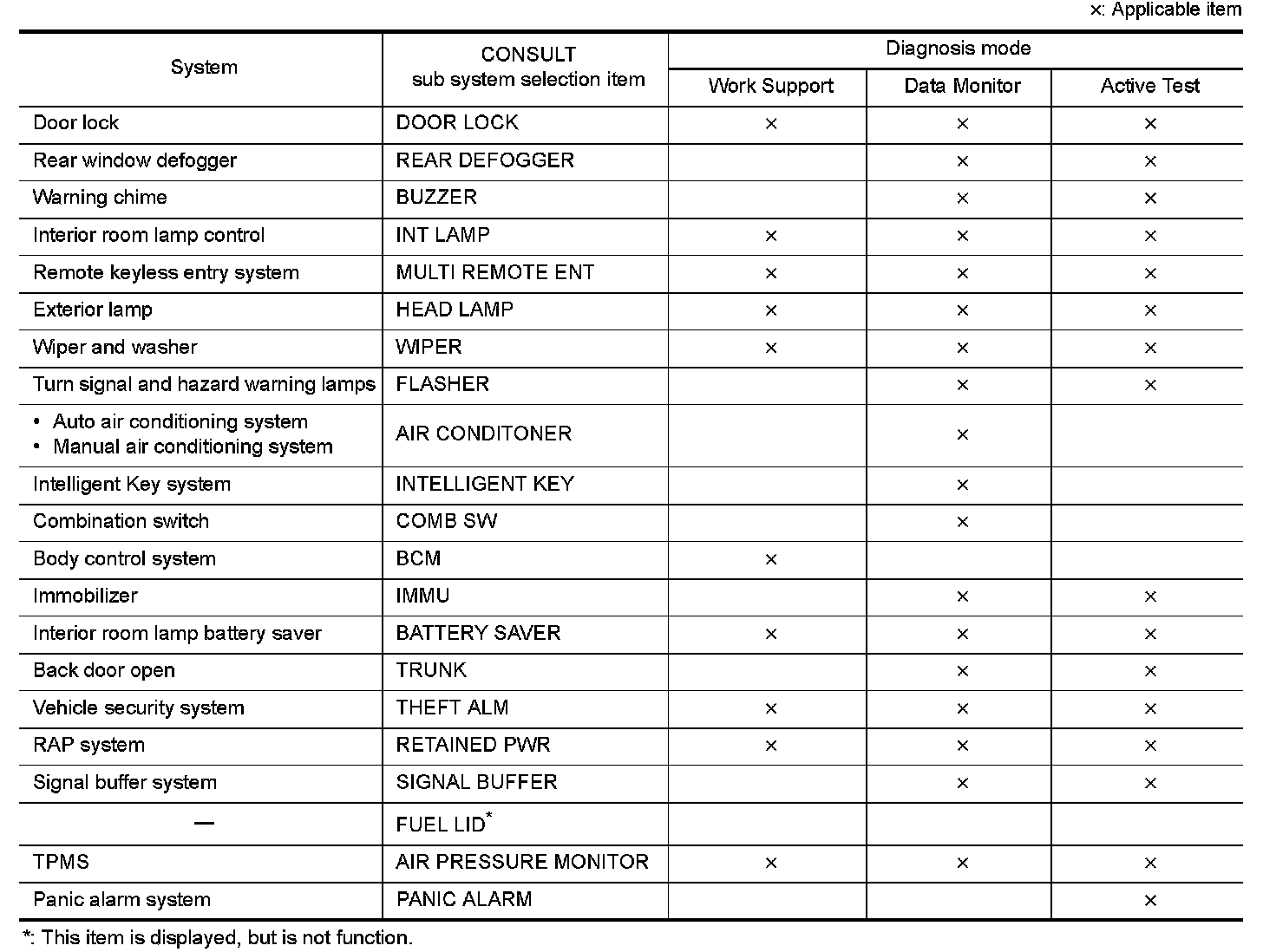 It can perform the diagnosis modes except the following for all sub system selection items.