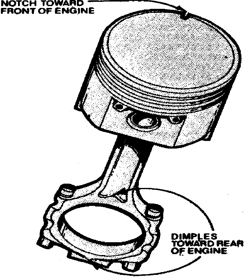 Assemble piston to rod with notch on piston facing toward front of engine and the raised notch side of rod at bearing end facing toward rear of engine, Fig. 11.