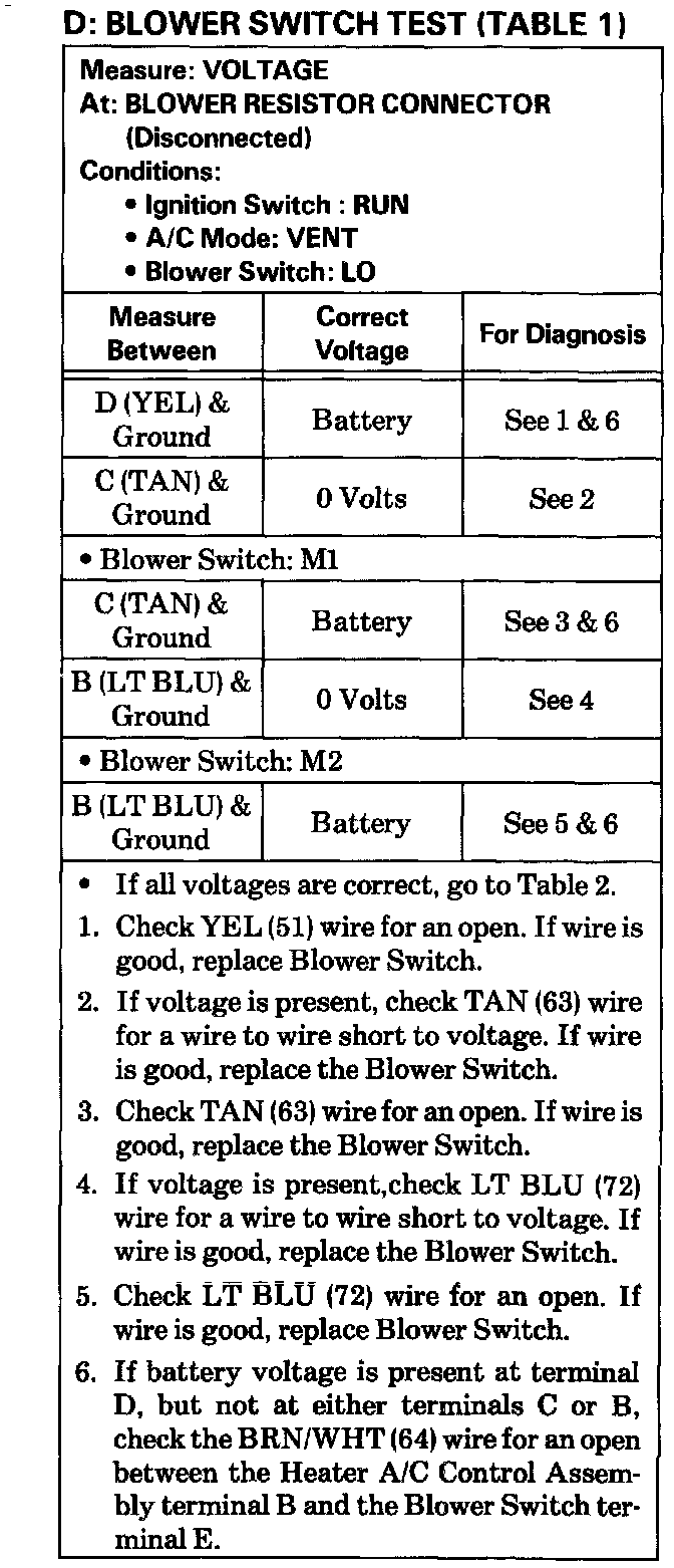 Test D Blower Switch Test Table 1. (part A):