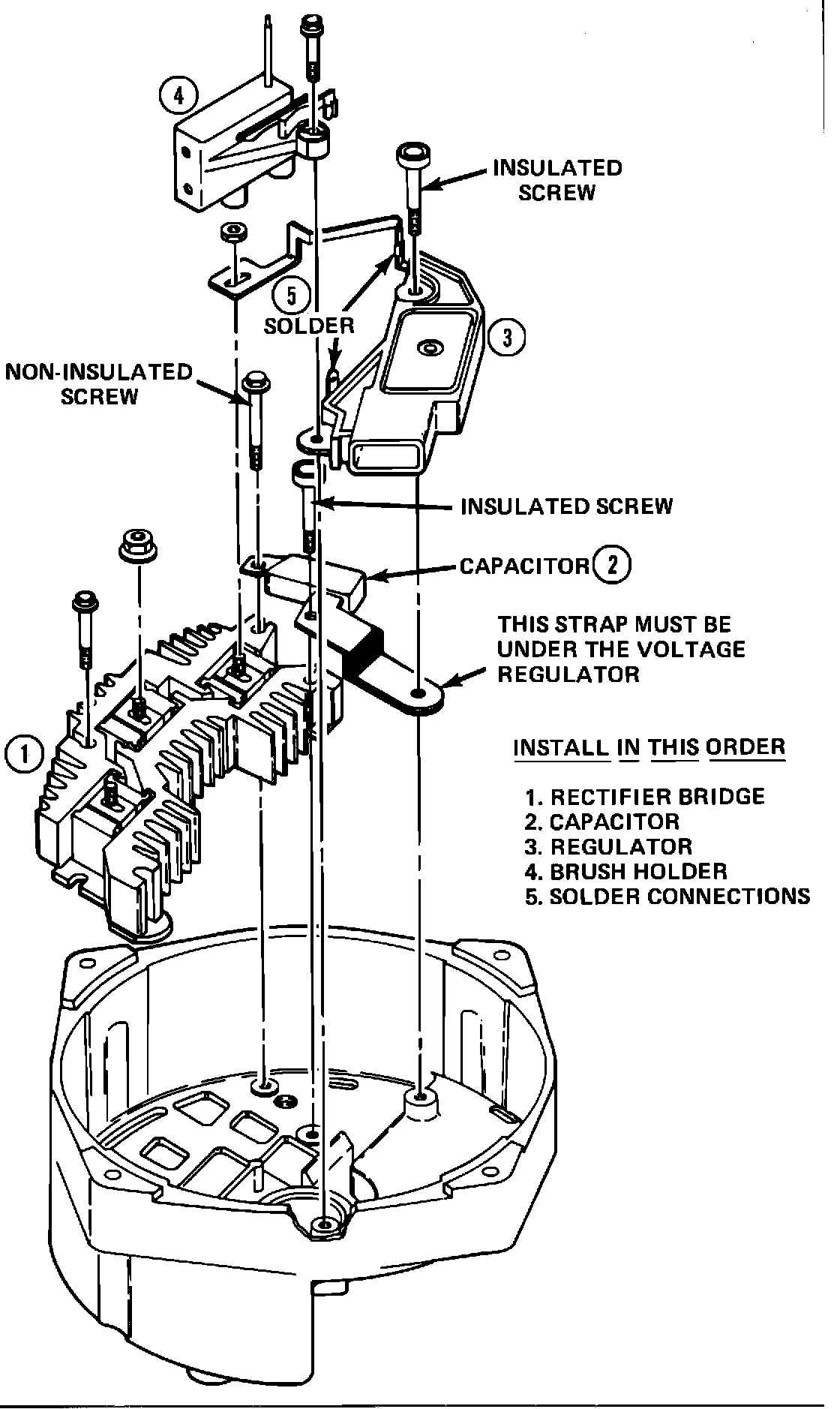 2. Install regulator and brush holder. The capacitor strap "metal side" touches the regulator connection. Tighten insulated screws.