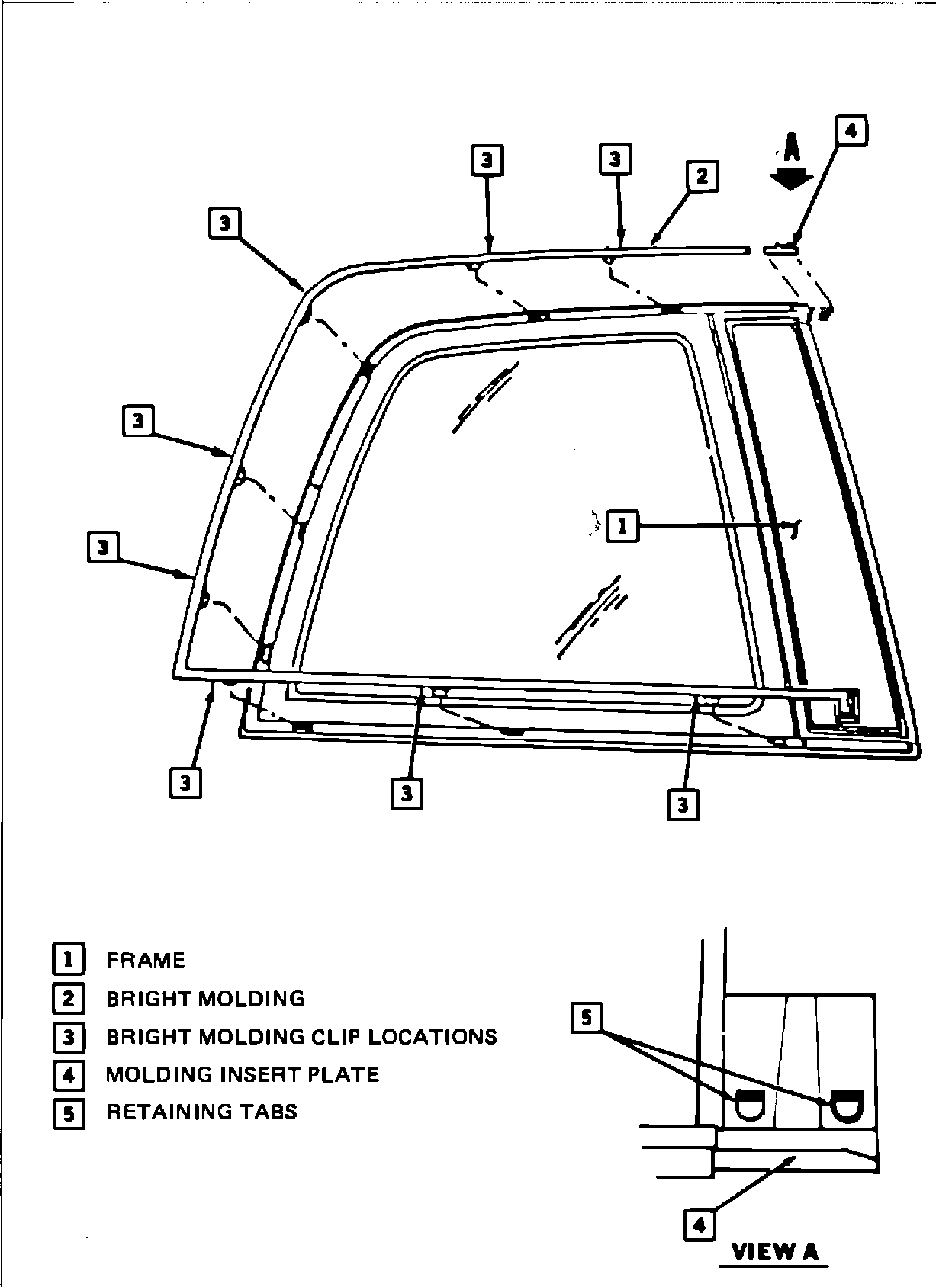 3. Grasp the free (top) end of the bright molding and carefully remove it from the quarter window frame module at the clip locations. Figure 1 View A. Use of a long narrow screwdriver slipped in under the molding will help disengage the clips.