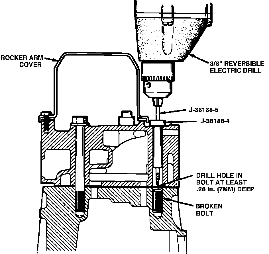 IMPORTANT: TOOL J-38188-3 IS A LEFT-HAND TWIST DRILL - IT IS CRITICAL THAT THE ROTATION OF THE ELECTRIC DRILL BE REVERSED PRIOR TO USING THE DRILL ROTATION OF THE DRILL SHOULD BE COUNTER-CLOCKWISE.