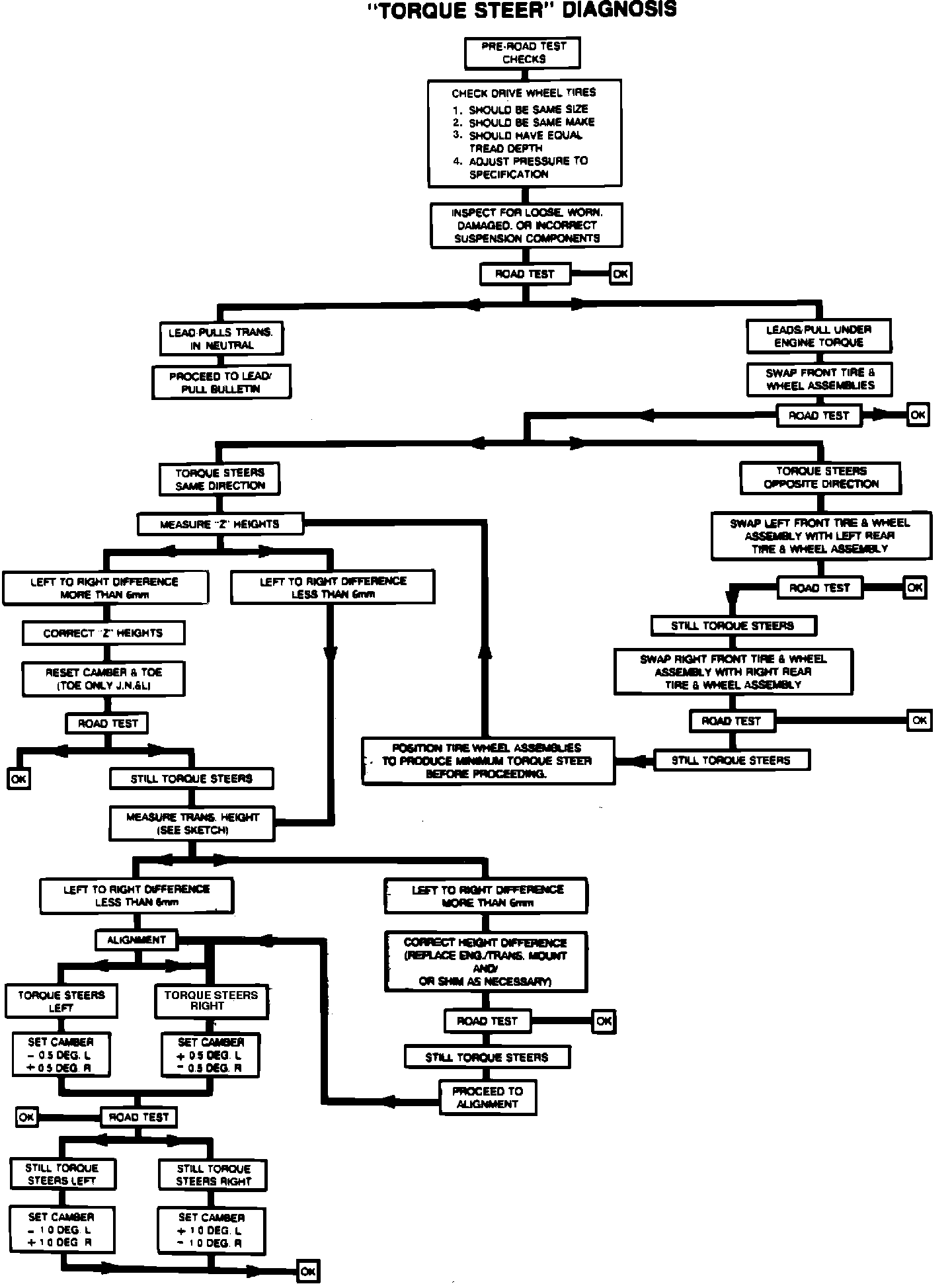 In conjunction with the attached "Torque Steer" Diagnosis Chart, the following possible causes of "Torque Steer" should be evaluated and repaired as necessary: