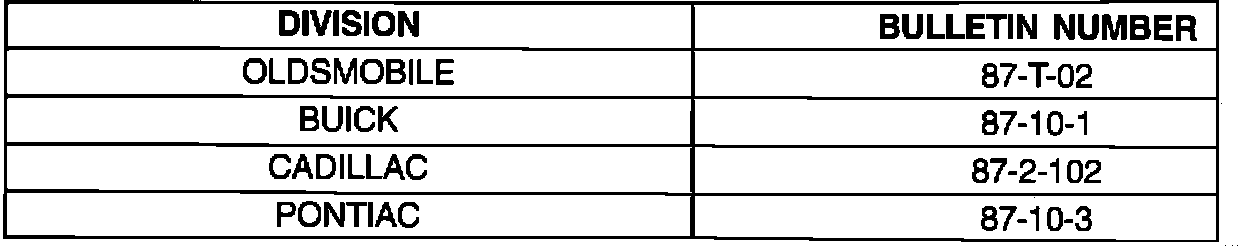 THIS BULLETIN IS BEING REVISED TO ADD ADDITIONAL MODEL YEARS AND CHANGE THE BUICK PART NUMBERS. PREVIOUS DIVISIONAL PUBLICATION NUMBERS WERE (see illustration).