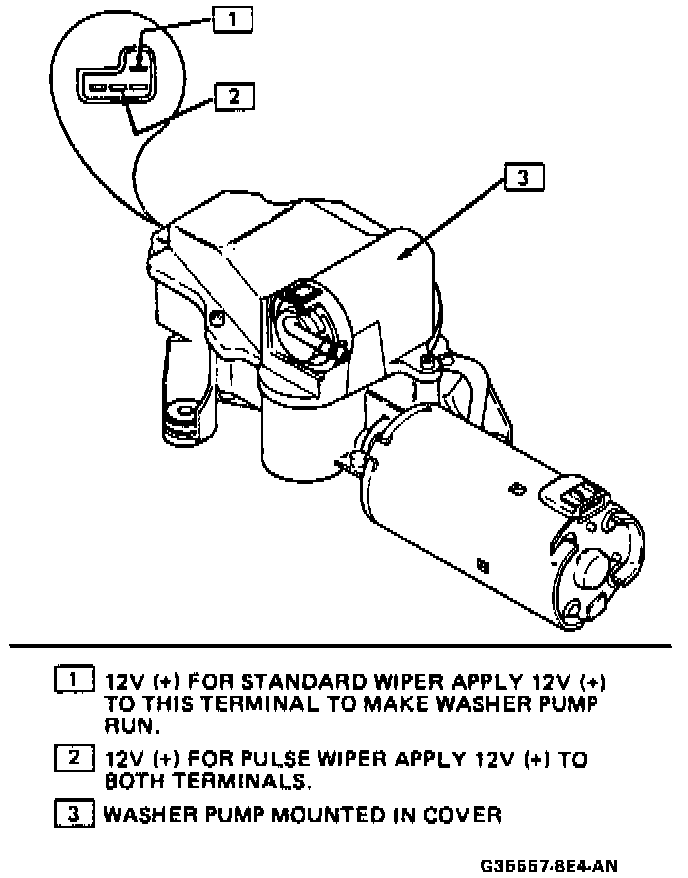 Check washer pump operation before removing wiper assembly from the vehicle. Disconnect (cover) wiring harness connection to wiper cover connector. Then apply a (+) 12 volt DC (source) voltage to wiper terminals see the third image, "Washer Pump On-Car Check."