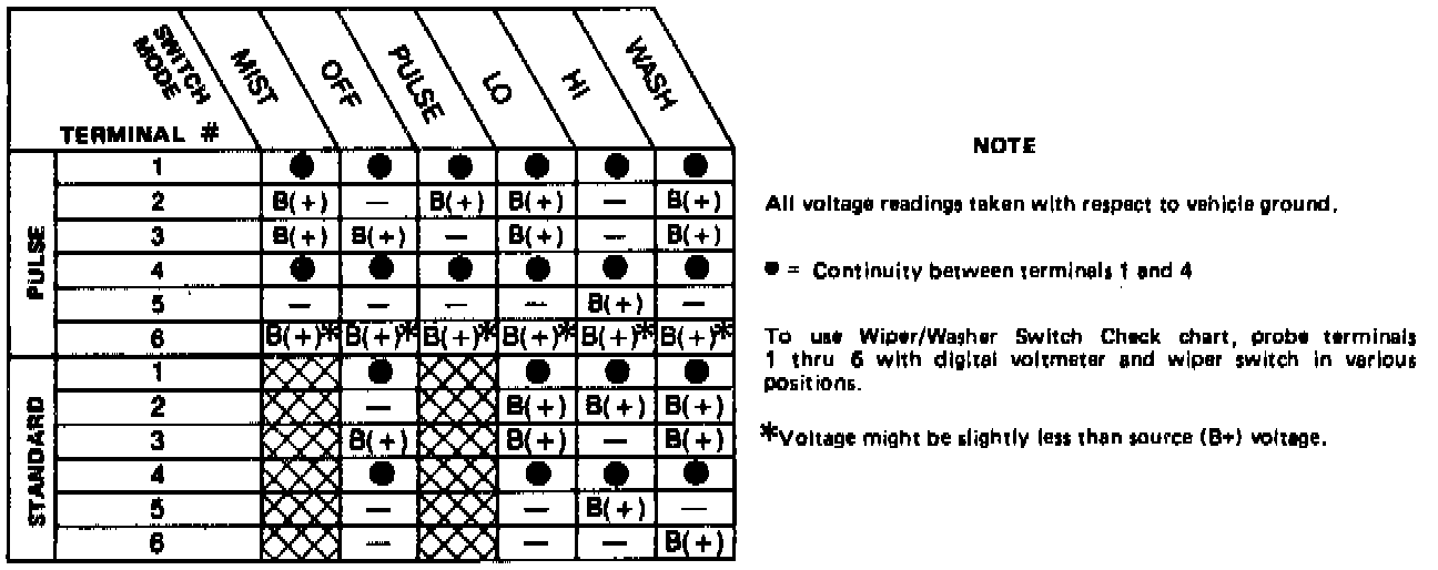2. If washer pump motor runs and pumps water, the problem is in the wiper wiper switch, refer to "Wiper/Washer Switch Check Chart."