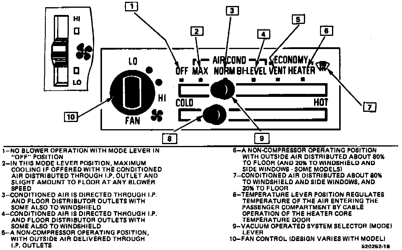 The operation of the A/C system is controlled by the switch and levers on the control assembly. The compressor clutch and blower are connected electrically to the control assembly by a wiring harness. The blower circuit is open in the "OFF" mode. In all other modes the blower has four speeds to control the amount of air flow.