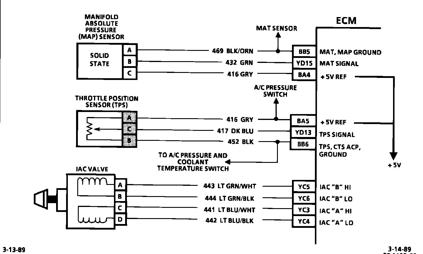 Check for open in IAC CKTs 441, 442, 443, and 444 or faulty connections at ECM terminals "YC3", "YC4", "YC5" and "YC6" or IAC terminals "A" and "C". An IAC valve which is stopped in an open position and can't respond to the ECM, or minimum air rate throttle stop screw set too high, can also cause Code