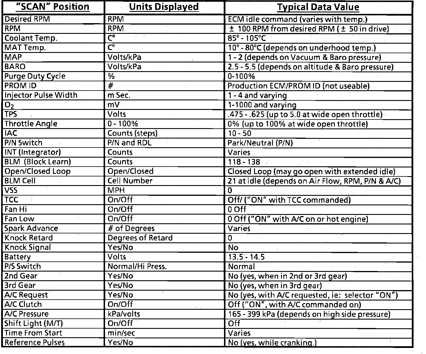 Typical Sensor "Scan" Data Values: