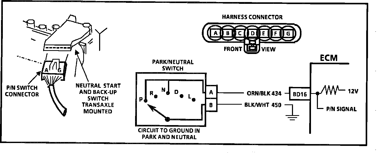 The Park/Neutral Switch contacts are a part of the Neutral Start switch and are closed to ground in park or neutral, and open in drive ranges and reverse.