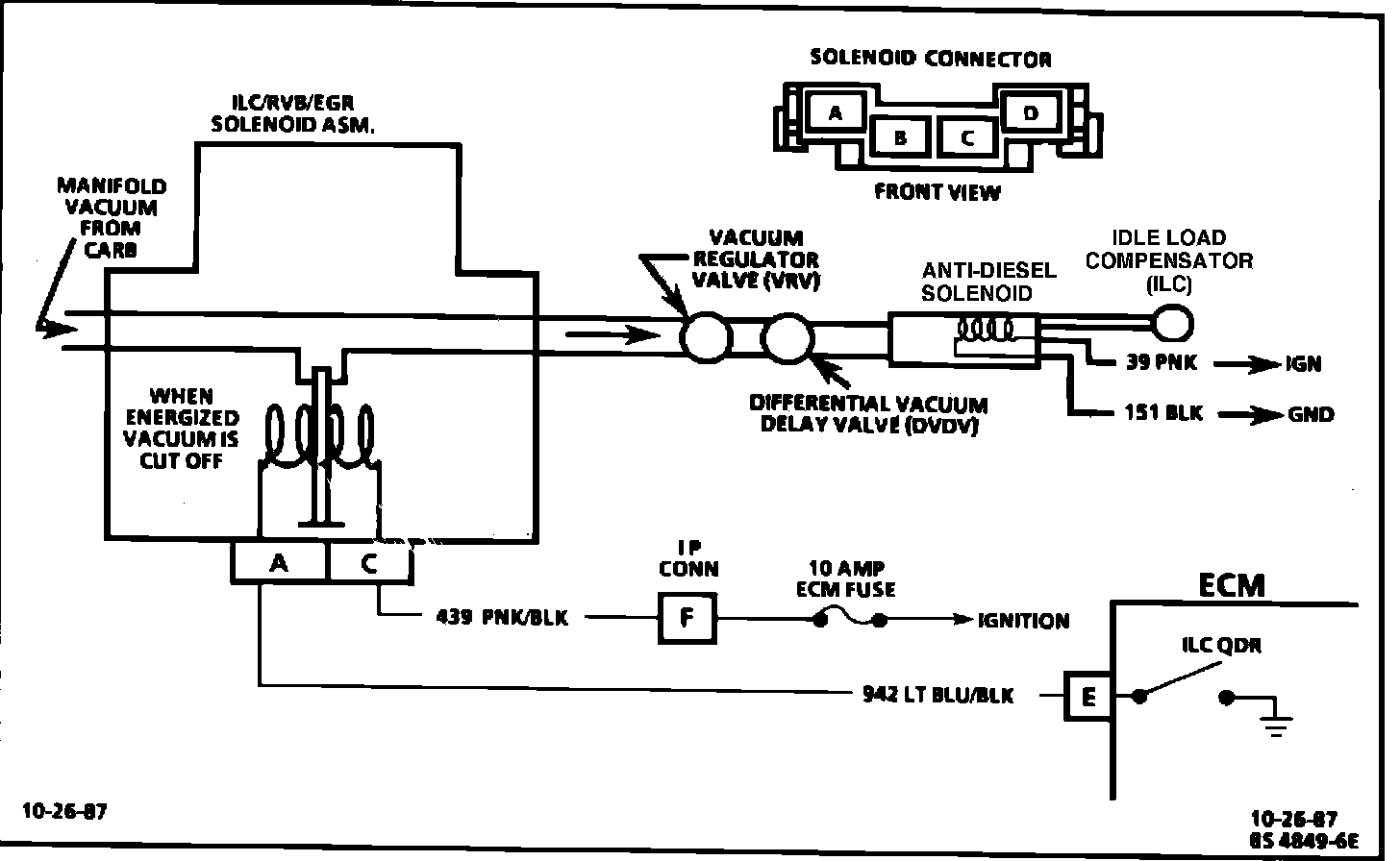 The idle load compensator (ILC) is mounted on the carburetor and is used to control various low engine rpm conditions. The ILC uses a spring loaded vacuum sensitive diaphragm whose plunger extends when vacuum is not present. Vacuum to the ILC is controlled by the ECM through the ILC/RVB/EGR solenoid assembly. When the ECM turns "ON" the ILC solenoid assembly, vacuum is cut "OFF" to the ILC. Vacuum is regulated through the VRV and delayed under high load conditions (checked) by the DVDV and through the Anti-diesel solenoid (ADS). The ADS is energized when the IGN is turned on, allowing vacuum to the ILC, and turned "OFF" when the IGN is "OFF". This traps vacuum to the ILC, keeping the plunger retracted so the engine can shut down without dieseling.