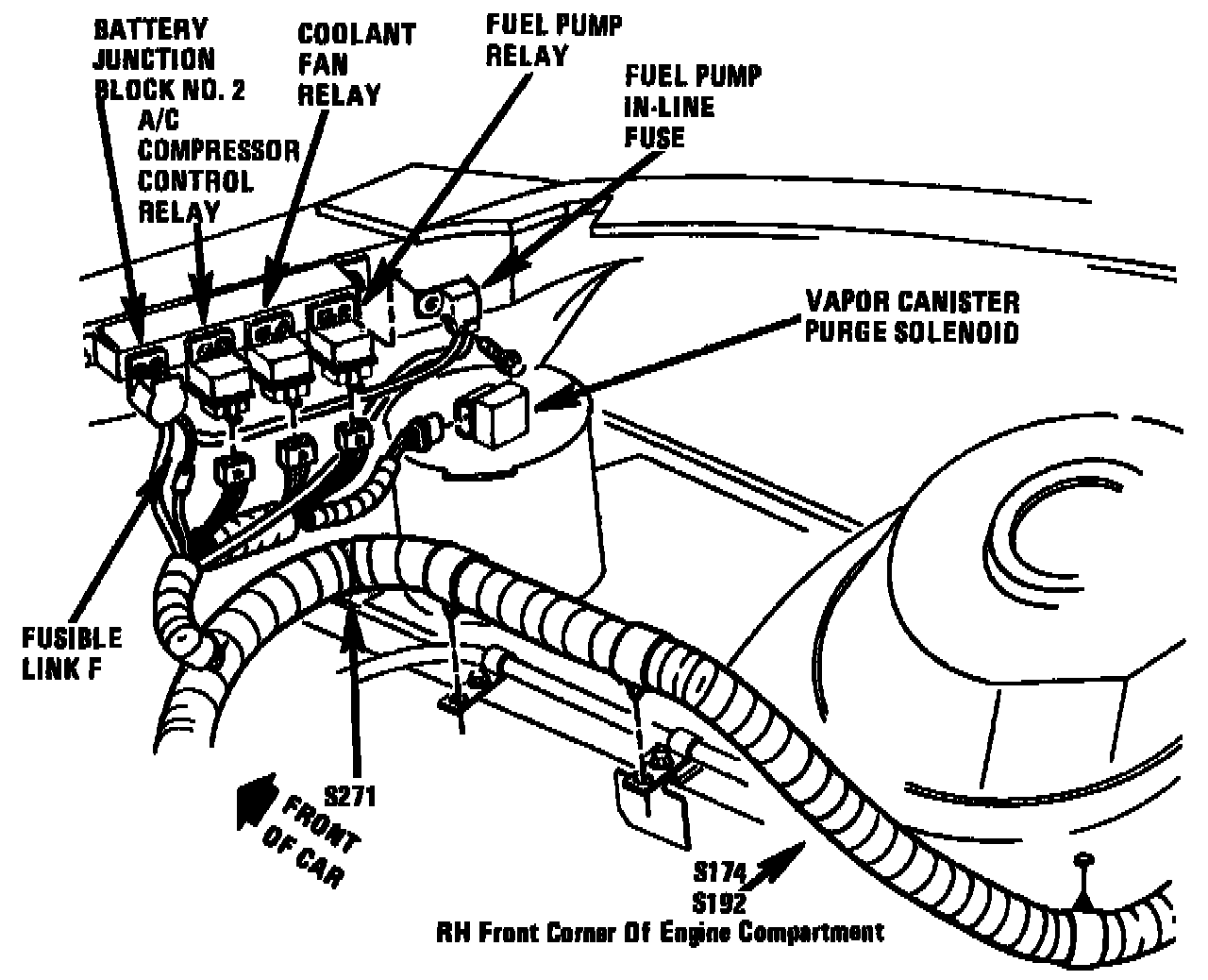 The Fusible Link F is located on the RH front corner of engine compartment, on bracket.