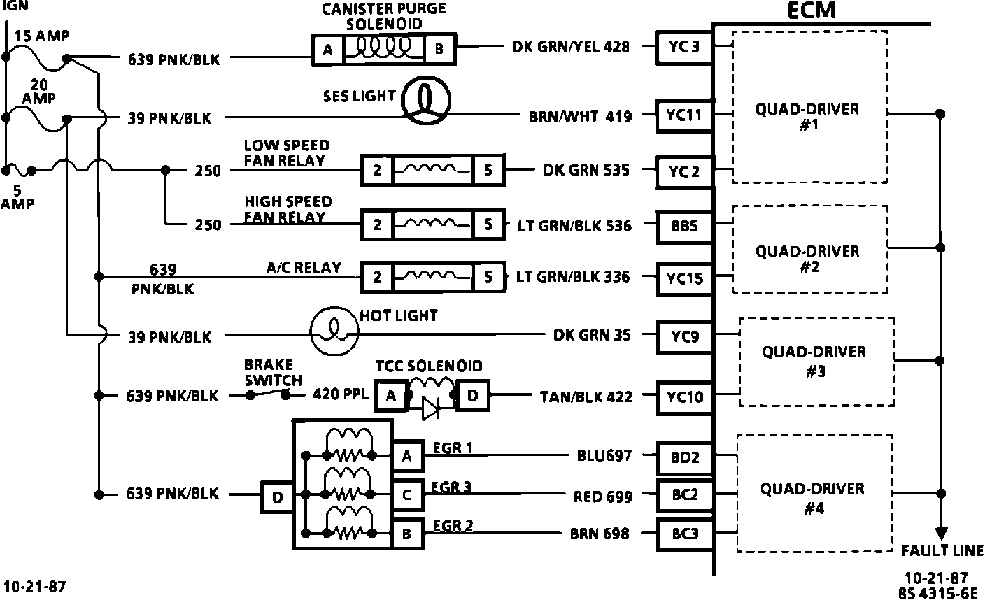 3. This test will determine which circuit is out of specifications. All circuits EXCEPT "YC11", the SES light, and "YC9", the "hot light", should be B + when key is "ON", engine not running. The diagnostic test terminal is not grounded.