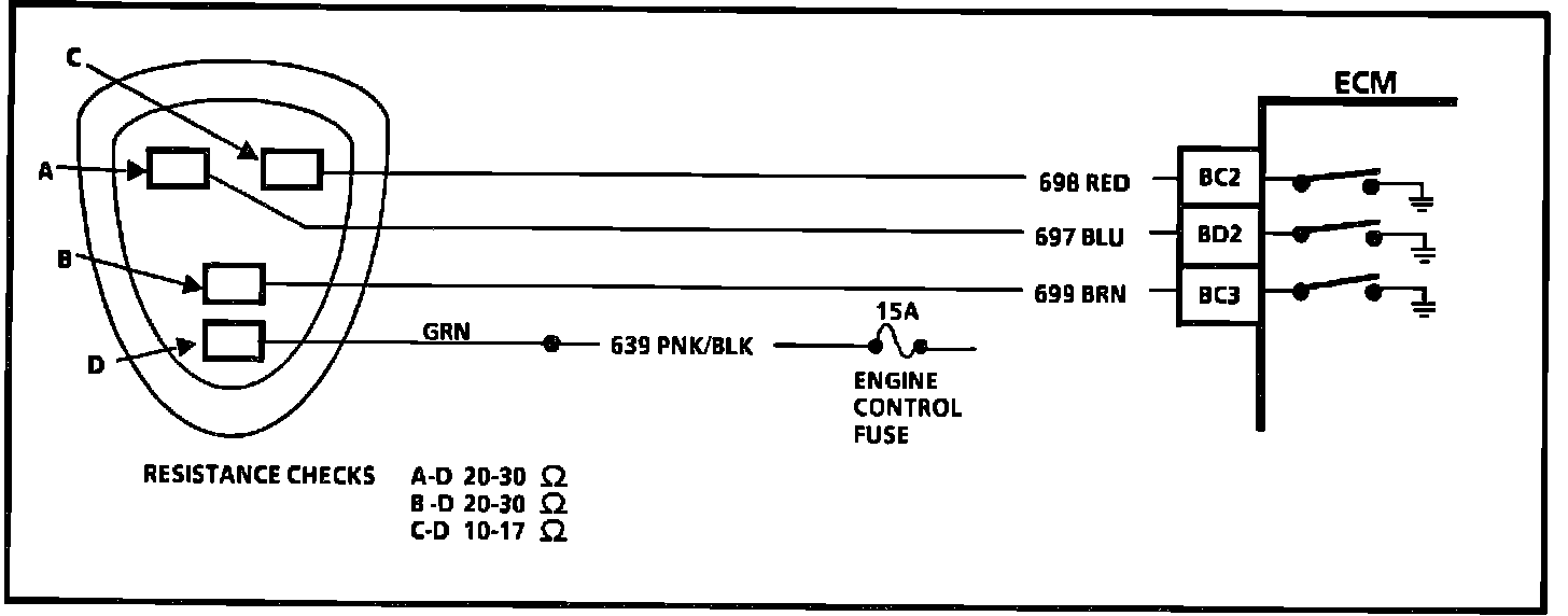 Start and idle engine and with a jumper, ground terminals "A," "B" and "C" one at a time. You should be able to discern a change in engine rpm as the terminal is grounded.