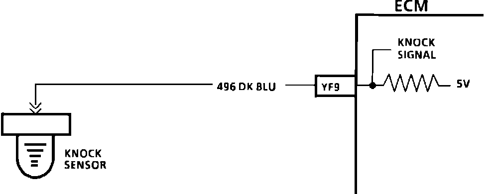 The knock sensor is used to detect engine detonation and the ECM will retard the electronic spark timing based on the signal being received. The circuitry within the knock sensor causes the ECM's 5.0 volts to be pulled down so that CKT 496 would measure about 2.5 volts. The knock sensor produces an AC signal which rides on the 2.5 volts DC voltage. The amplitude and frequency are dependent upon the knock level.