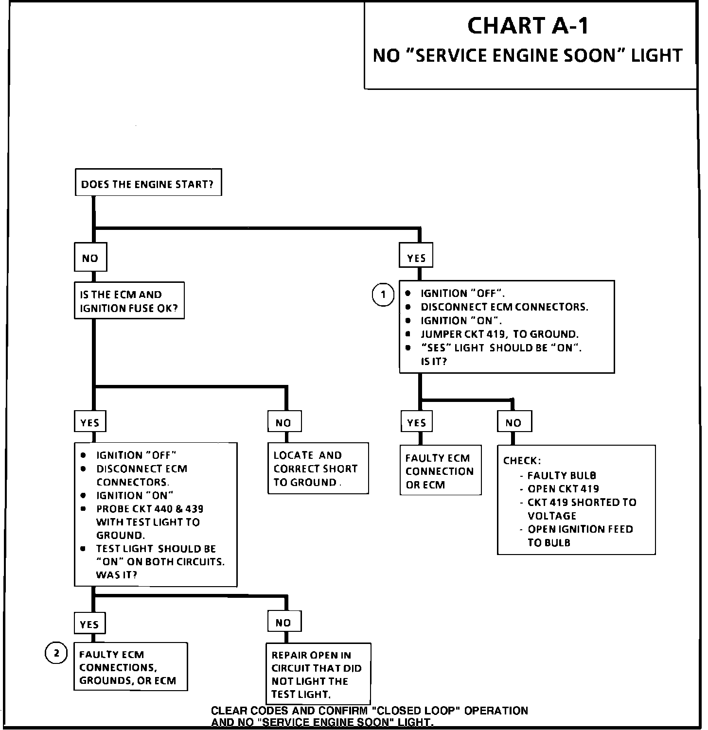 There should always be a steady "SERVICE ENGINE SOON" light when the ignition is "ON" and engine stopped. Ignition voltage is supplied to the light bulb. The ECM will control the light and turn it "ON" by providing a ground path through CKT 419.