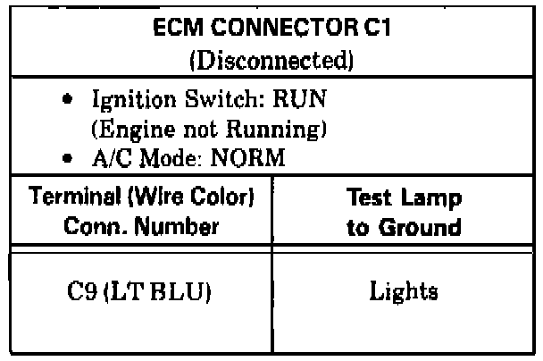 1. Reconnect the A/C Cut-Out Relay. Remove the connectors from the ECM and check the voltage to ground using a test lamp at the following terminals.