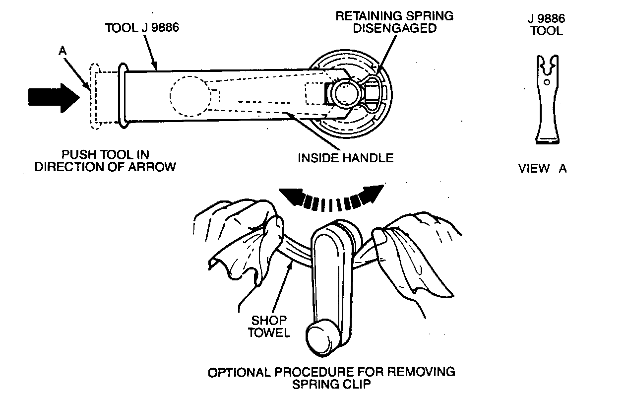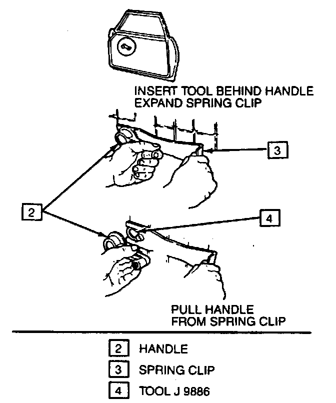 1. Spring clip (3) by inserting tool J 9886 between handle and trim panel.