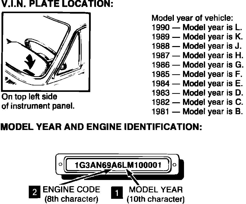 (1) MODEL YEAR IDENTIFICATION: Refer to illustration of Vehicle Identification Number (V.I.N.). This year is indicated by a code letter.