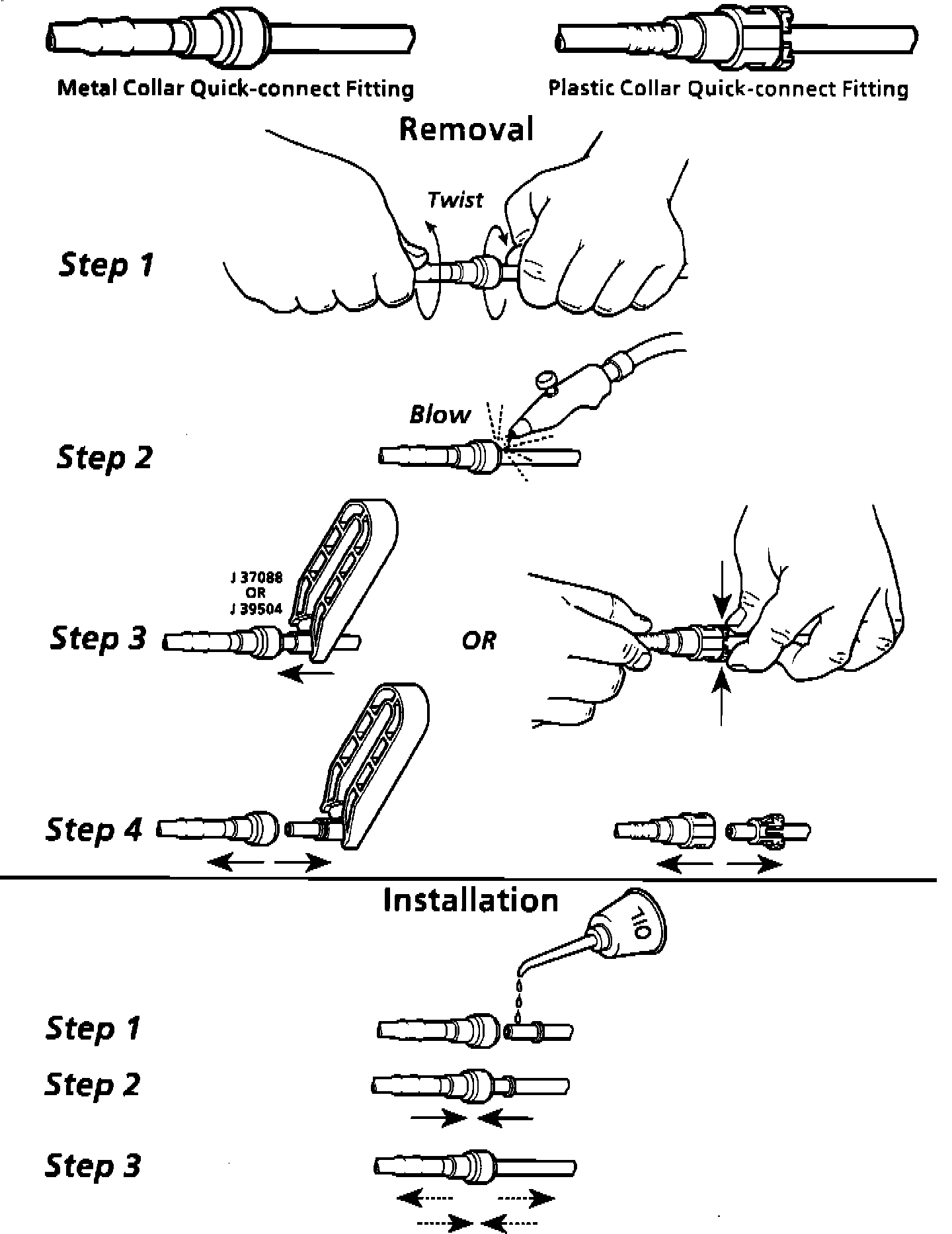 4. Grasp the filter and one nylon fuel connecting line fitting. Twist the quick-connect fitting 1/4 turn in each direction to loosen any dirt within the fitting. Repeat with the other fitting.