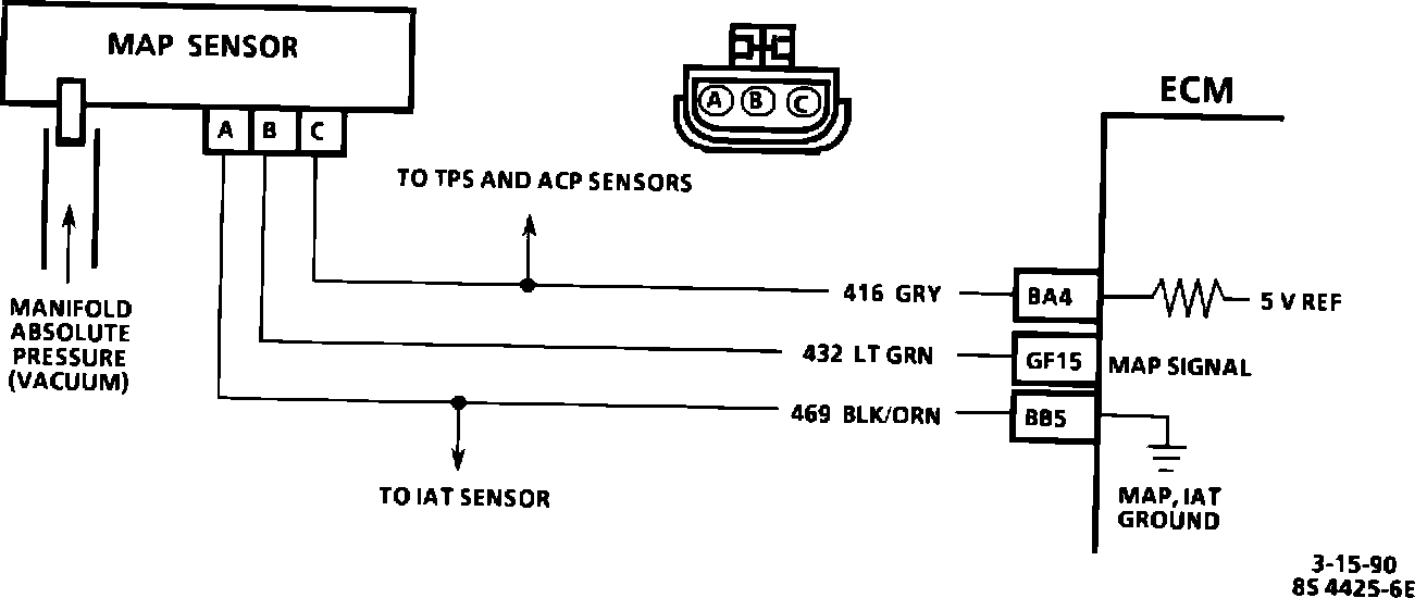 3. Check vacuum hose to sensor for leakage or restriction. Be sure no other vacuum devices are connected to the MAP sensor vacuum hose.