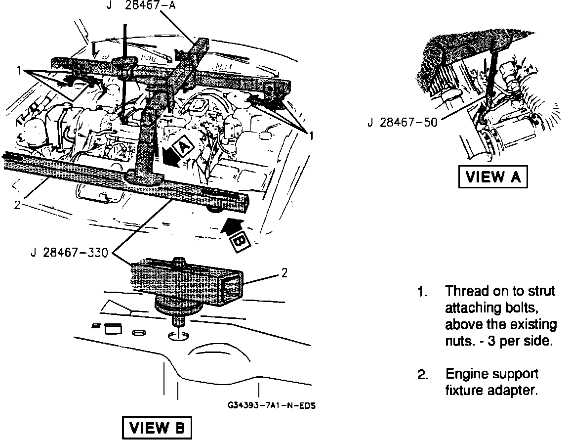 Use J 28467-330 Engine Support Fixture Adapter for supporting the engine when servicing engine/transmission components. - To use J 28467-330 adapter:
