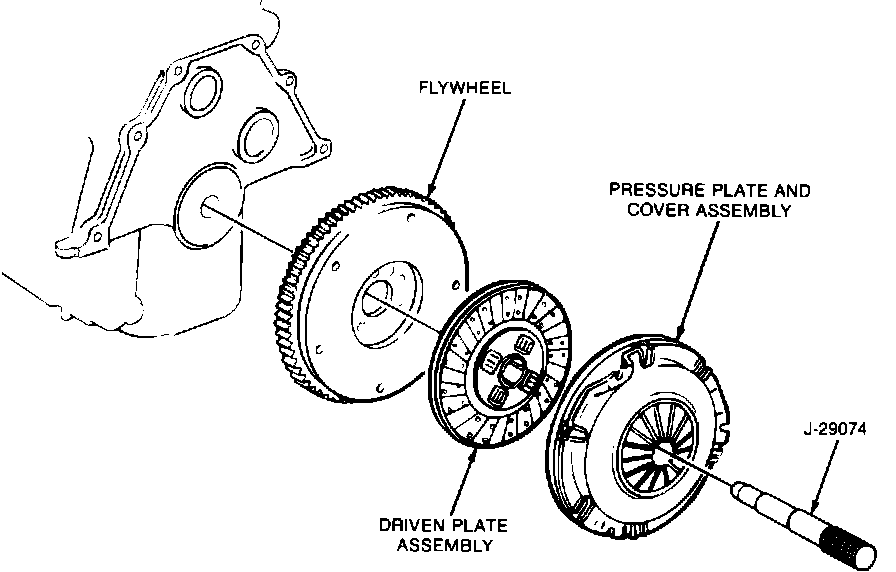 8. Place pressure plate and driven disc in position and support with tool No. J-29074, Fig. 3. The driven disc is installed with the damper springs offset toward the transaxle. Stamped letters found on the driven disc identify the ``Flywheel Side.''