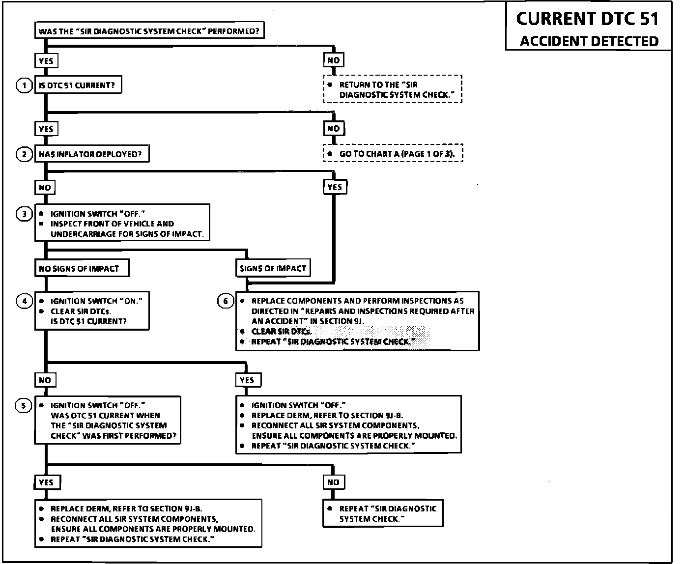 The following procedure is necessary after air bag deployment. DTC 51 (Accident Detected) will be set when a frontal crash with air bag deployment has occurred. After replacing SIR components DTC 51 will need to be cleared from the DERM. If DTC 51 is not cleared the SIR warning lamp will stay "ON."