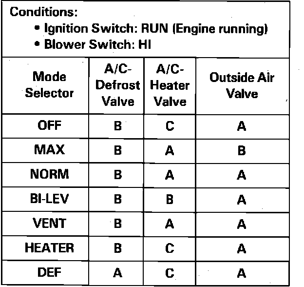 ^ If air flow does not come from the proper outlets under one or more operating modes, at least one of the air valves is not moving to the proper position.^ Check the operation of the air valves using the chart. Put Blower Switch in HI to give a strong flow of air.