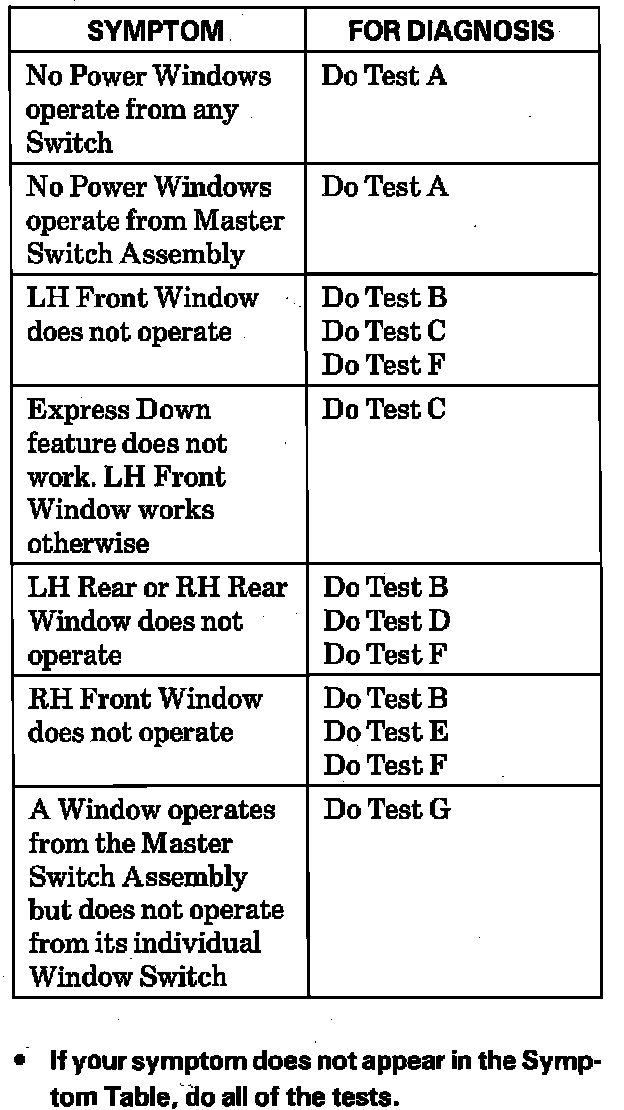 Power Windows Symptom Chart: