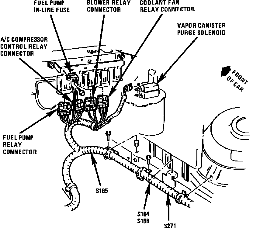 The Fuel Pump In-Line Fuse is located in the RH front of engine compartment, on relay bracket.