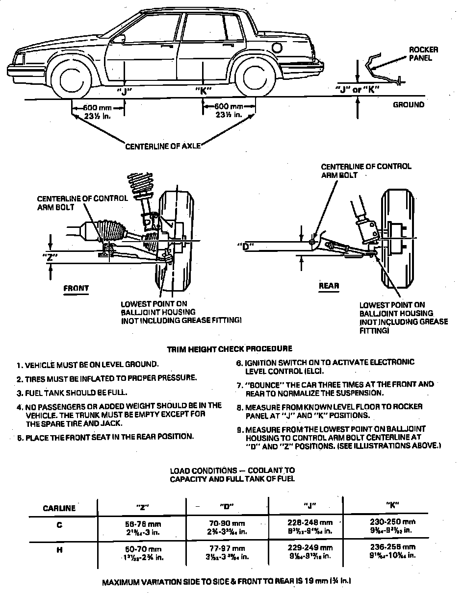 Trim heights are checked with tires at recommended pressure, fuel tank at capacity, front seat in rear position, no passengers and trunk empty, except for spare tire and jack.