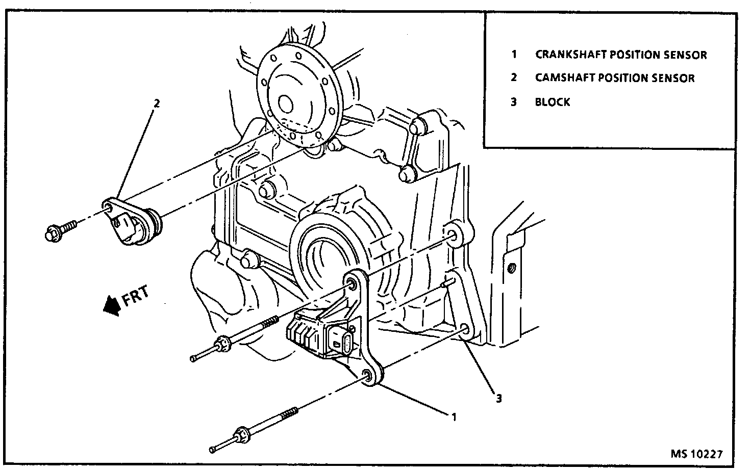 The camshaft position sensor is located on the timing cover behind the water pump near the camshaft sprocket.