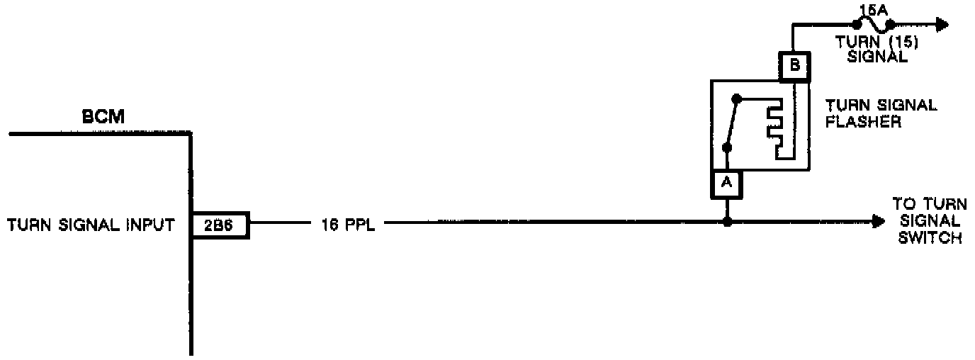 The turn signal flasher is provided voltage through the turn signal fuse (15) whenever the ignition is on. When the turn signal switch closes, providing a path to ground through the left or right turn signal lamps, the flasher alternately opens and closes. The BCM monitors CKT 16 to determine if the turn signal switch is closed and the turn signal lamps are on (i.e. toggling voltage). If the turn signals are left on for more than a one mile, the BCM will send the TURN SIGNAL ON message to the driver information center.