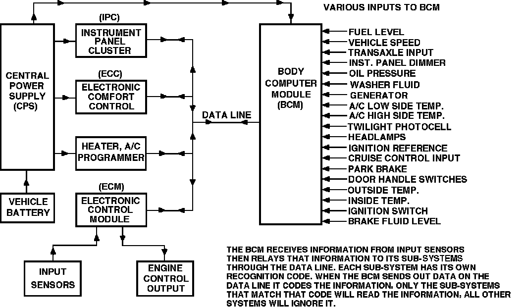 This vehicle uses several electronic components which form an electronic computer network, designed to control various engine and body sub-systems. The heart of the computer network is the Body Computer Module (BCM). The BCM has an internal microprocessor which is the center for communication with all the other components, and controls the on-board diagnostics of the vehicle. All system sensors and switches are monitored by the BCM or one of the five other major components that complete the computer system network. The other five components are the Diagnostic Energy Reserve Module (DERM) (Supplemental Inflatable Restraint (SIR) controller), Electronic Climate Control (ECC) panel, Heating, Ventilation, and Air Conditioning (HVAC) programmer, the Instrument Panel Cluster (IPC), and the Powertrain Control Module (PCM).