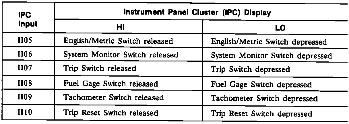 After "Diagnostic Mode" is entered any trouble codes stored in computer memory will be displayed on the season odometer. Codes may be stored for the PCM, BCM, or SIR systems. Each trouble code consists of the system abbreviation (E, B, or R) E=PCM B=BCM R=SIR, a three digit code, and the letter C or H. All codes for each system are displayed together, in the order of their three digit number (lowest first - i.e. E013, E014, etc.). The final digit of the code, a C or an H is used to indicate whether the code is current or history.