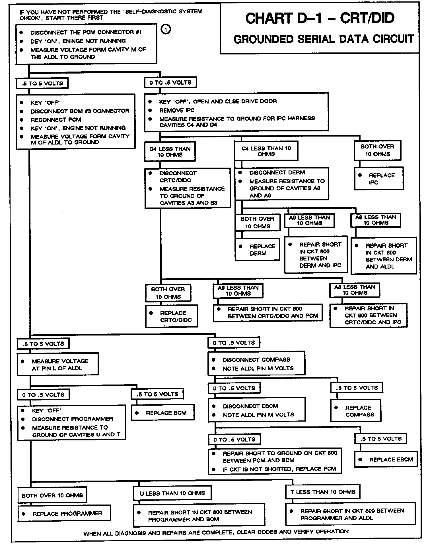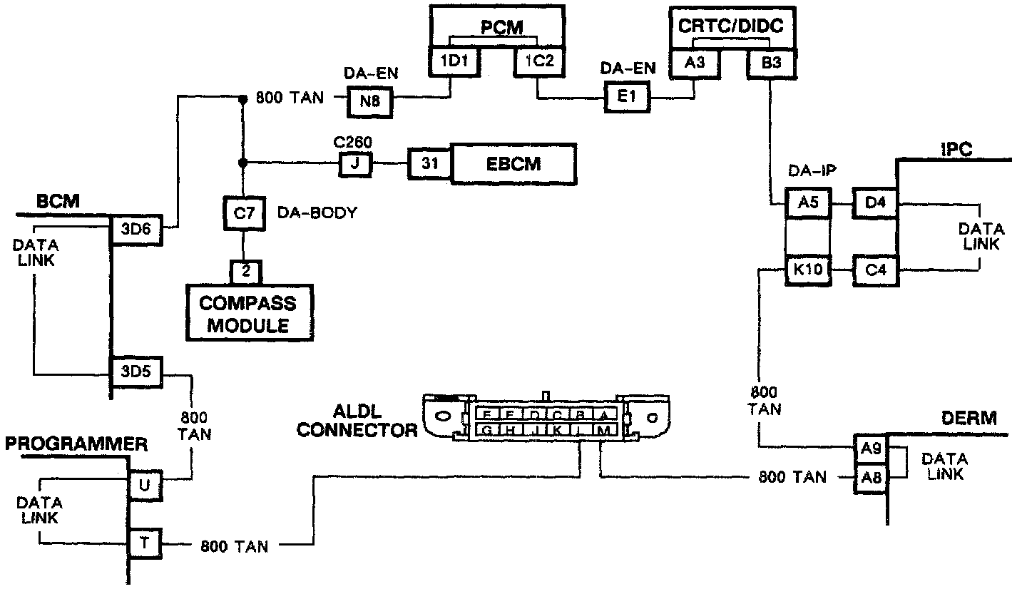 With a grounded serial data circuit the BCM will not be able to communicate with any other devices in the system. Voltage measured anywhere along the circuit will be zero. The display on the IPC will be "ELECTRICAL PROBLEM" and the CRT/DID will display normally, but HVAC controls will not function.