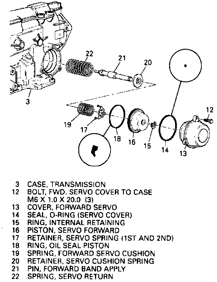8. Remove servo cover bolts, servo cover, servo piston, sealing ring, apply pin, servo spring retainer and servo spring.