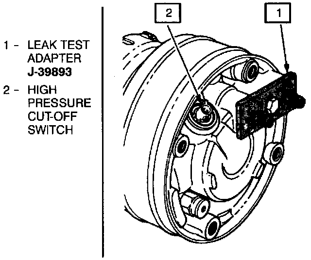 3. Using leak detector J 39400, check for leaks at pressure relief valve, rear head switch location, compressor front and rear head seals, through bolt head gaskets and compressor shaft seal.