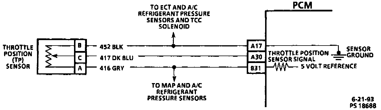 The TPS has three internal circuits. One to ground, a second from the PCM as a 5.0 volt reference source and a third circuit is used by the PCM to measure the output voltage. As the throttle angle changes (pressing down on accelerator pedal) the TPS voltage output varies from about .5 volt at idle to about 4.9 volts at wide open throttle (WOT).